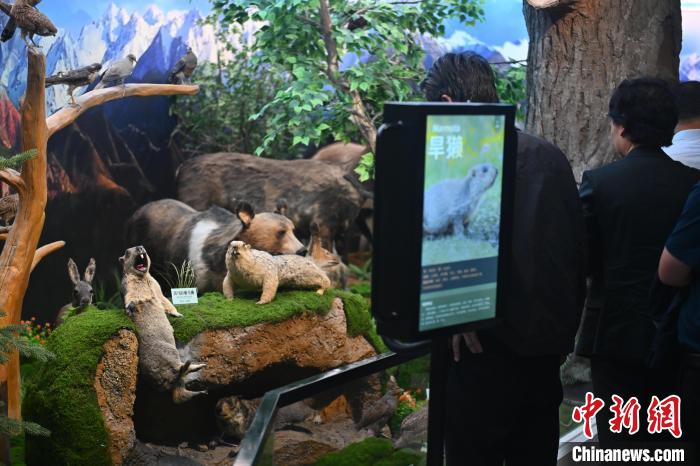 6月16日,在位于甘肅省張掖市肅南裕固族自治縣的祁連山國家公園自然博物館內(nèi),游人參觀喜馬拉雅旱獺標(biāo)本。中新社記者 李亞龍 攝