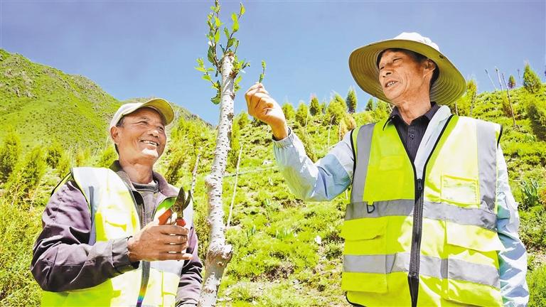 在2號片區(qū),一支特殊養(yǎng)護隊伍映入眼簾。十幾位藏族村民在技術(shù)員的指導下修剪枝條,掌握技術(shù)后將成為專業(yè)管護人員。村民的動作略顯生疏,但專注的神情流露出對樹苗的珍視。