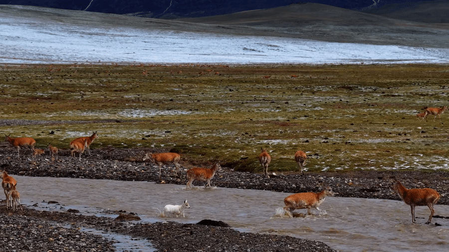近日,藏羚羊群中,一只罕見(jiàn)的白色小藏羚羊緊隨母親,踏過(guò)河水順利抵達(dá)對(duì)岸,雪白的身影在群中格外醒目。