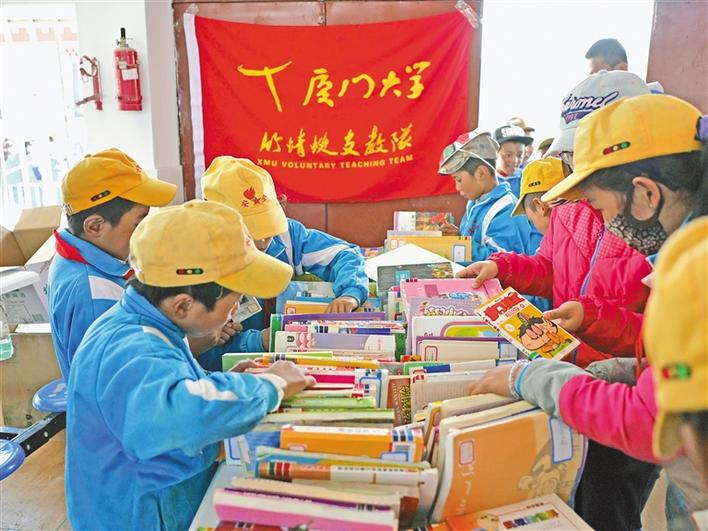 圖為廈門大學(xué)竹蜻蜓支教隊(duì)在當(dāng)雄縣龍仁鄉(xiāng)中心小學(xué)舉辦流動圖書館活動。通訊員 黃宇霞 高捷 何春雨 崔慶煒