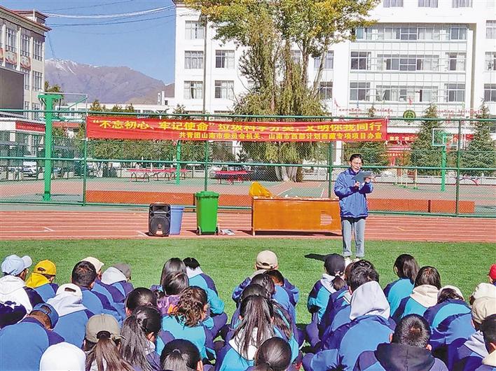西藏山南市共青團(tuán)志愿者給學(xué)生講垃圾分類
