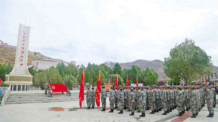 圖為駐藏某汽車團(tuán)野外駐訓(xùn)分隊(duì)在江孜宗山英雄紀(jì)念碑前開(kāi)展主題黨課活動(dòng)。加央群決 李豪 攝