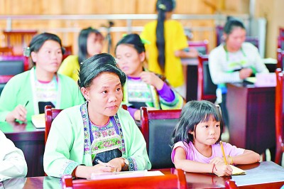 9月12日,在桂黔交界的大苗山深處,代時(shí)英和女兒在烏英苗寨“雙語(yǔ)雙向”培訓(xùn)班聽課。新華社發(fā)