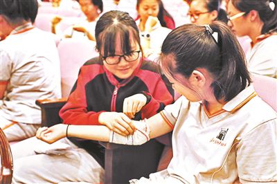 練習急救包扎(資料圖) 供圖/北師大附中