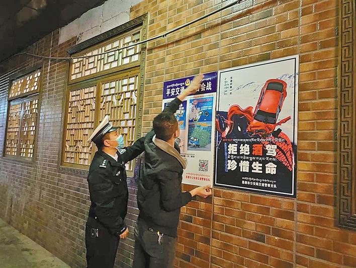 圖為林芝市公安交警支隊民警在張貼宣傳資料。記者 張黎黎 攝