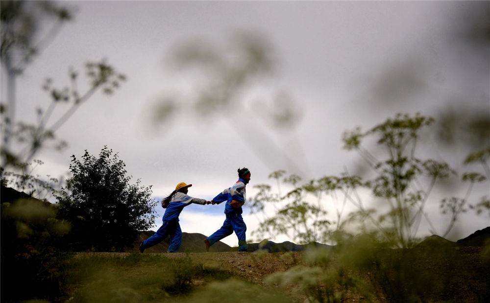 西藏拉薩市墨竹工卡縣的兩名孩子放學(xué)回家(2010年7月14日攝)。新華社記者 普布扎西 攝
