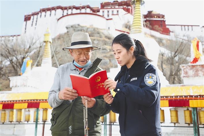 圖為西藏出入境邊防檢查總站執(zhí)法調(diào)查支隊(duì)民警在宗角祿康公園向過(guò)往群眾宣傳憲法知識(shí)。仁青旺堆 張一鳴 攝