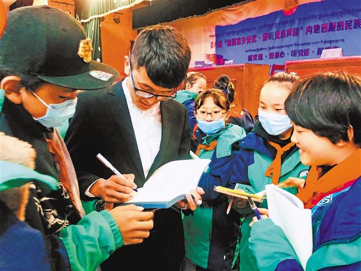宣講活動(dòng)過程中,共青團(tuán)西藏自治區(qū)委員會(huì)副書記格桑卓瑪、西藏青年報(bào)社副社長(zhǎng)洛桑頓珠給6所學(xué)校內(nèi)地西藏班的學(xué)生們贈(zèng)送了《西藏青年報(bào)》《西藏青年》等刊物和書籍。格桑卓瑪語重心長(zhǎng)地囑咐孩子們:“作為新時(shí)代的新青年,要時(shí)刻牢記時(shí)代賦予的新使命,要用新時(shí)代的標(biāo)尺審視自己,用科學(xué)文化武裝自己,淡化宗教消極影響,在新征程的熔爐中鍛造自己,努力使自己成為堪當(dāng)民族復(fù)興大任的新青年,在全面建設(shè)社會(huì)主義現(xiàn)代化國家新征程中貢獻(xiàn)自己的青春力量,做神圣國土的守護(hù)者、幸福家園的建設(shè)者,在青春的閃光中踐行‘感黨恩、愛核心、聽黨話、跟黨走’的家國情懷?!?/p>