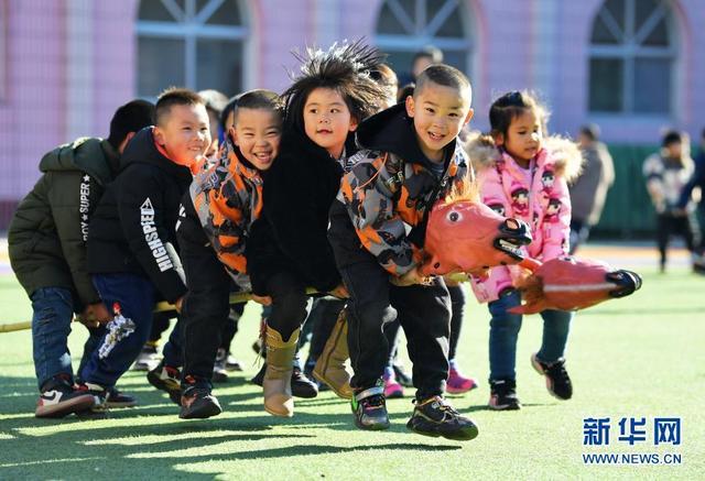 12月14日,河北省樂亭縣第三幼兒園的孩子們在玩騎竹馬游戲。新華社記者 牟宇 攝