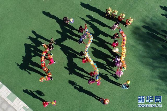12月14日,河北省樂亭縣第三幼兒園的孩子們在玩舞龍游戲(無人機照片)。