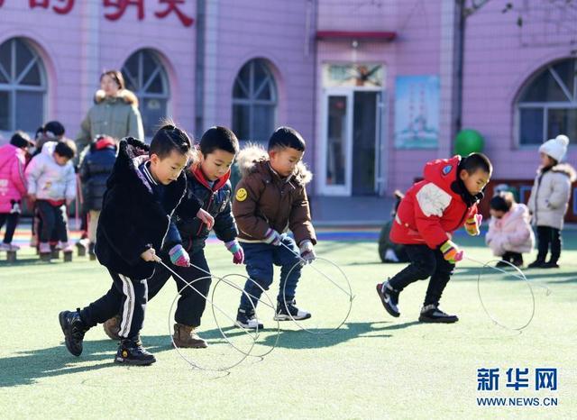 12月14日,河北省樂亭縣第三幼兒園的孩子們在玩滾鐵環(huán)游戲。