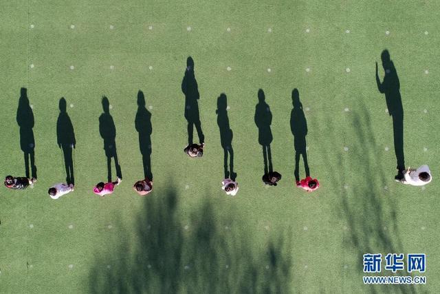 12月14日,河北省樂亭縣第三幼兒園的孩子們在玩踩高蹺游戲(無人機照片)。