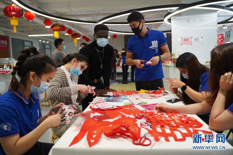 2月8日,北京交通大學(xué)留學(xué)生在體驗剪紙。新華社記者 張浩波 攝
