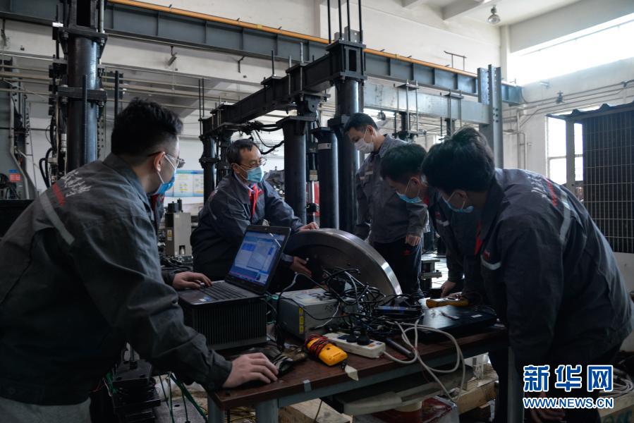 2月9日,北京交通大學(xué)教師和學(xué)生在結(jié)構(gòu)強度檢測實驗室一起研討高速列車輪軸結(jié)構(gòu)可靠性。新華社記者 徐欽 攝