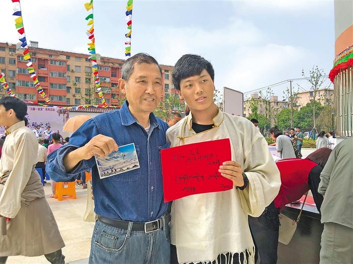 圖為江蘇省南通中學(xué)藏文化社團(tuán)在南通市北濠社區(qū)開展藏文化宣傳與展示活動時,藏族學(xué)生把藏文書寫的明信片贈送給當(dāng)?shù)厥忻瘛?圖片由江蘇省南通中學(xué)提供