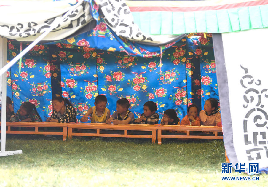 8月2日,在青海省果洛藏族自治州瑪沁縣下大武鄉(xiāng)年扎村“育苗加油站”的帳篷里,小朋友們在進(jìn)行繪畫。新華社記者 張龍 攝