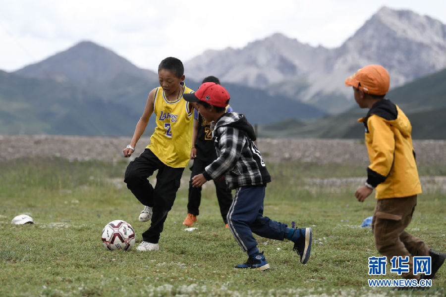 8月2日,在青海省果洛藏族自治州瑪沁縣下大武鄉(xiāng)年扎村的“育苗加油站”,班瑪多杰(左一)與小伙伴踢球。新華社記者 張龍 攝