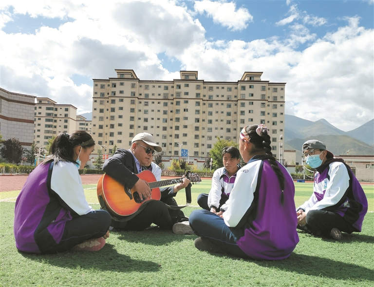 “在古城拉薩有個愛我的家,他的名字就叫特殊家……”在特校操場上,一群視障孩子圍著特校盲部的斯勇老師,放聲歌唱。對于平均年齡十幾歲的盲童來說,雖然看不見世界的色彩繽紛,但絲毫不影響他們對于知識的渴求和對世界的好奇,這離不開特校老師斯勇手把手的教導。