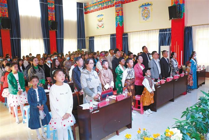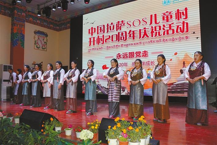 在中國拉薩SOS兒童村開村20周年慶?;顒?dòng)上,SOS村全體干部職工和孩子們共唱國歌。