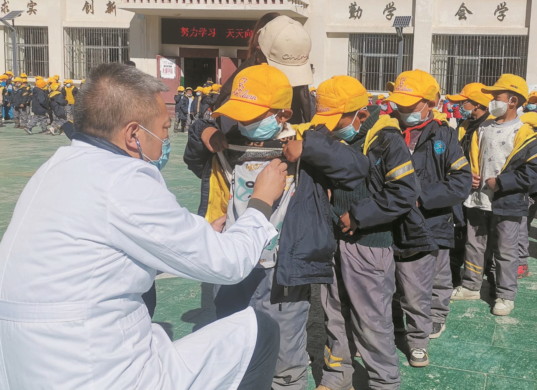 圖為醫(yī)療專家為墨竹工卡縣尼瑪江熱鄉(xiāng)小學的學生進行聽診器檢查。拉薩融媒記者 白 央攝