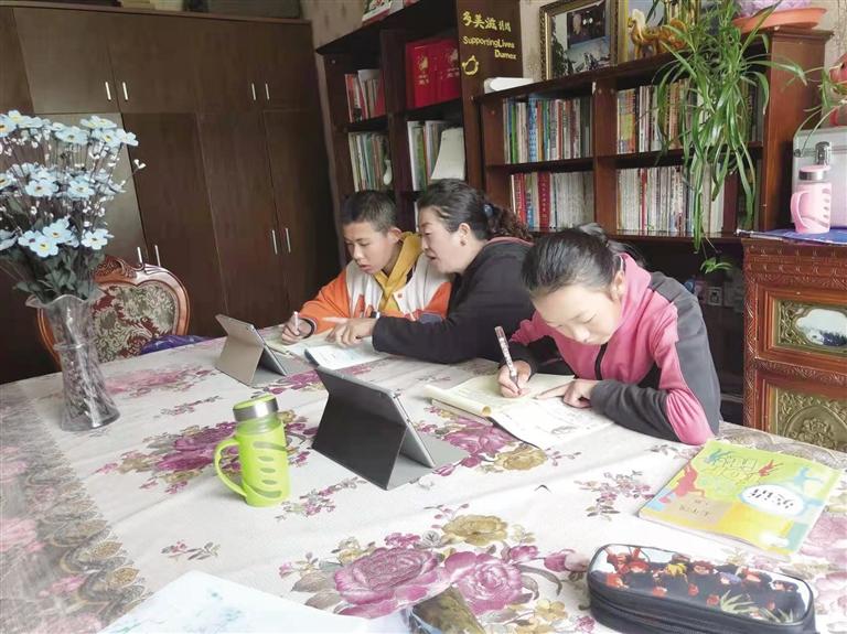 中國拉薩SOS兒童村的媽媽為孩子輔導(dǎo)作業(yè)。記者 王靜 攝