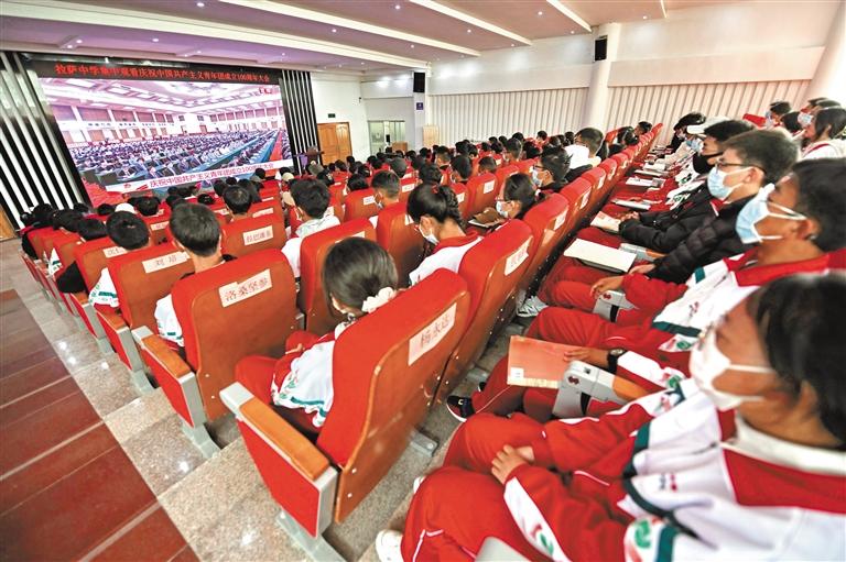圖為拉薩中學(xué)的師生觀看慶祝中國共產(chǎn)主義青年團(tuán)成立100周年大會(huì)直播。 記者 唐斌 攝