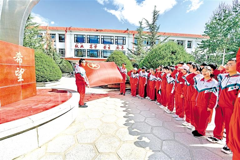圖為拉薩中學(xué)的學(xué)生在團(tuán)旗下重溫入團(tuán)誓詞。