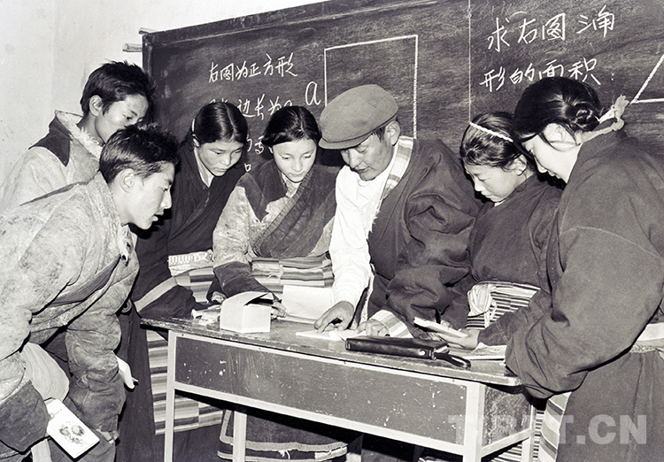 這是班戈縣小學(xué)校長申卻堅(jiān)村在給學(xué)生上課(唐召明1987年攝)