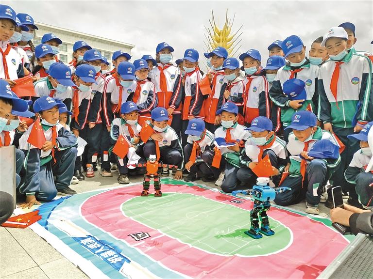 圖為啟動儀式現(xiàn)場,學(xué)生圍觀科技產(chǎn)品“機器人跳舞”的場景。記者 扎西頓珠 攝