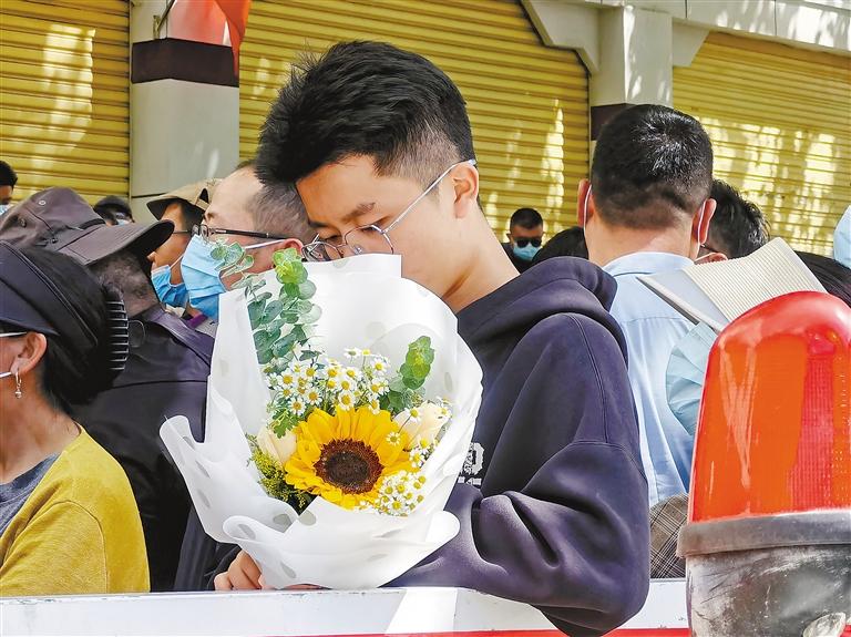 圖為家長手捧向日葵在考點外等候考生。記者 王莉 攝