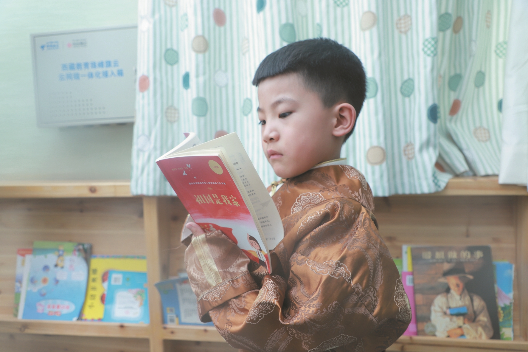 圖書(shū)館里,來(lái)自拉薩市江蘇實(shí)驗(yàn)幼兒園大五班的小朋友益西加措仔細(xì)地挑選著自己喜歡的書(shū)籍,只見(jiàn)他饒有興致地選中這本《祖國(guó)是我家》,并發(fā)現(xiàn)了書(shū)中“我在南京,我為中華之崛起而讀書(shū)”的卡片時(shí),他回應(yīng)道:“我在西藏,我為中華之崛起而讀書(shū)?!?/p>