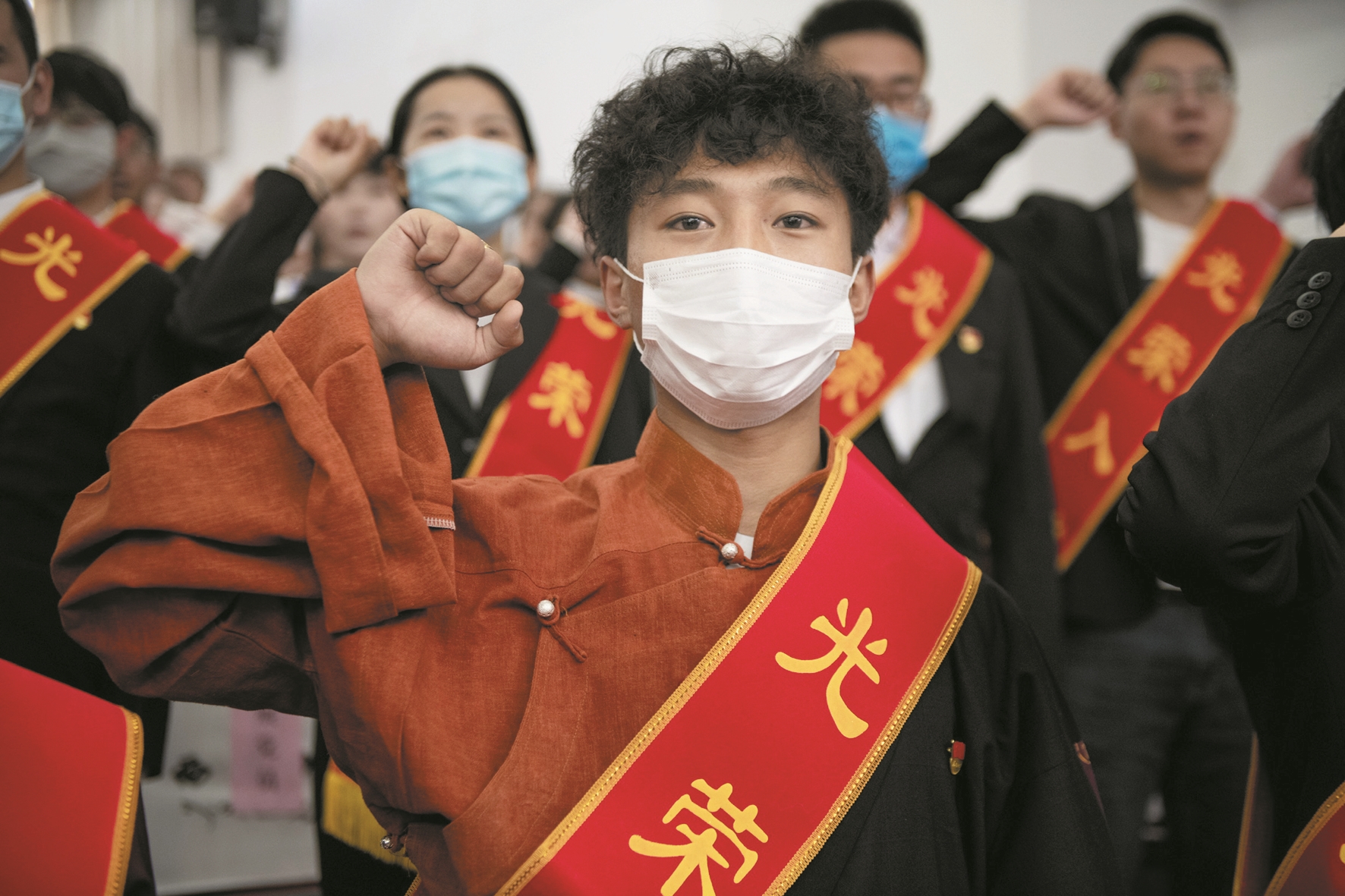 圖為西藏大學(xué)理學(xué)院19級(jí)新入黨學(xué)生拉巴平措在黨旗前莊嚴(yán)宣誓。拉薩融媒記者 玉珠多杰攝