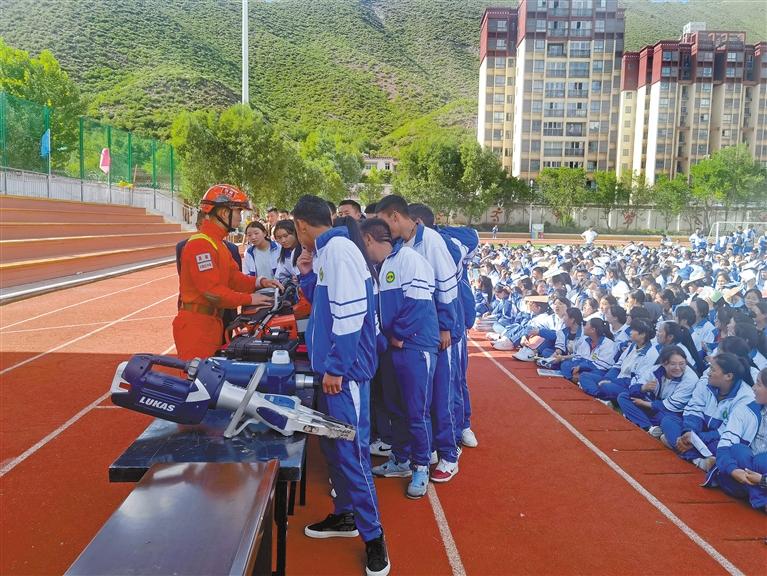 圖為昌都市卡若區(qū)森林消防中隊消防救援人員向?qū)W生展示救援裝備。記者 桑鄧旺姆 通訊員 張強 攝