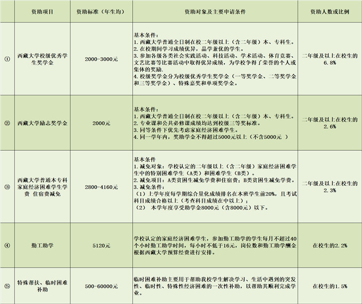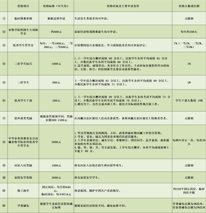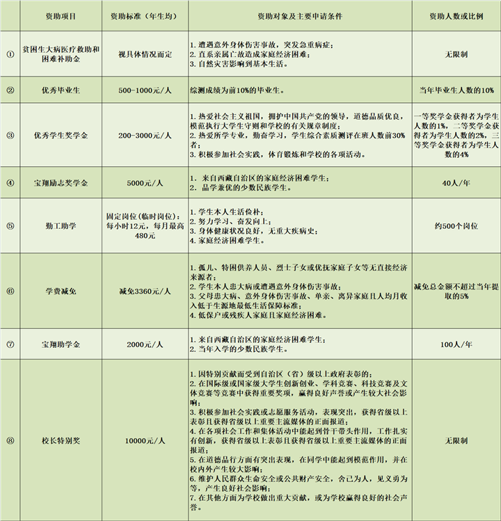 這些資助項(xiàng)目包括國(guó)家政策、西藏自治區(qū)政策和西藏各高校的政策,全部列出了明確的申請(qǐng)條件,涵蓋了學(xué)生生活、學(xué)習(xí)的方方面面。其中,有的項(xiàng)目針對(duì)家庭經(jīng)濟(jì)困難的學(xué)生給予學(xué)費(fèi)、住宿費(fèi)等的減免;有的項(xiàng)目為學(xué)生提供各種校內(nèi)勤工助學(xué)機(jī)會(huì),讓學(xué)生通過(guò)勞動(dòng)獲得報(bào)酬;有的項(xiàng)目獎(jiǎng)勵(lì)入伍,有的項(xiàng)目獎(jiǎng)勵(lì)發(fā)明創(chuàng)造……并且,西藏各高校在制定資助政策時(shí)體現(xiàn)出了各學(xué)校鮮明的辦學(xué)特點(diǎn)。例如,西藏藏醫(yī)藥大學(xué)設(shè)置了面向所有學(xué)生的“記誦《三部醫(yī)典》獎(jiǎng)”,要求“熱愛(ài)社會(huì)主義祖國(guó),擁護(hù)中國(guó)共產(chǎn)黨的領(lǐng)導(dǎo);遵紀(jì)守法,遵守學(xué)校規(guī)章制度;背誦學(xué)生按‘三部醫(yī)典’章節(jié)順序依次背誦。在背誦過(guò)程中,要吐字清晰,聲音宏亮,總時(shí)間不能超過(guò)2個(gè)小時(shí)。”凡是達(dá)到要求的學(xué)生,獎(jiǎng)勵(lì)1800元。