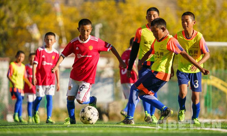 圖為2021年全國青少年體育冬夏令營進校園活動(西藏站)閉營儀式上,學(xué)生們正在進行足球比賽 攝影:趙耀