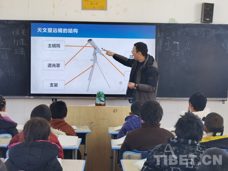 11月30日,王建煜受邀來到海拔4300多米的騾子溝小學(xué),帶著天文設(shè)備為牧區(qū)孩子們上了一節(jié)望遠(yuǎn)鏡觀測(cè)入門課。王建煜通過PPT展示了豐富的天文社團(tuán)活動(dòng),引起了孩子們強(qiáng)烈的好奇心和探索心。他介紹到,要想觀測(cè)到遙遠(yuǎn)的地方,必須要借助工具,而天文望遠(yuǎn)鏡,就是我們觀測(cè)星空的工具。