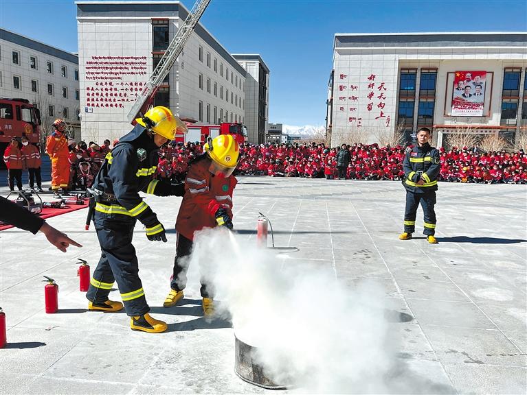 阿里陜西實驗學(xué)校學(xué)生在“開學(xué)第一課”中體驗消防滅火技能。普珍 記者 洛桑旦增 攝