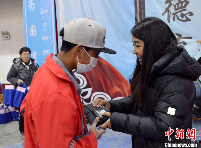 2021年,西藏那曲公益捐贈(zèng)活動(dòng)中,德慶玉珍(右)為青少年兒童送上成長(zhǎng)愛(ài)心包。(資料圖片) 受訪者 供圖