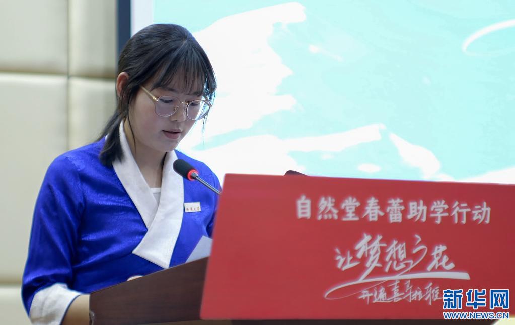 西藏大學2021級漢語言文學班學生德慶旺姆作為受資助學生代表發(fā)言時說:“國家和社會的各類資助給我和我的家庭帶來很大幫助,真誠感謝伽藍集團、學校、老師、同學和所有幫助我的人,我會在你們的支持和關愛中懂得感恩,學會去愛。”