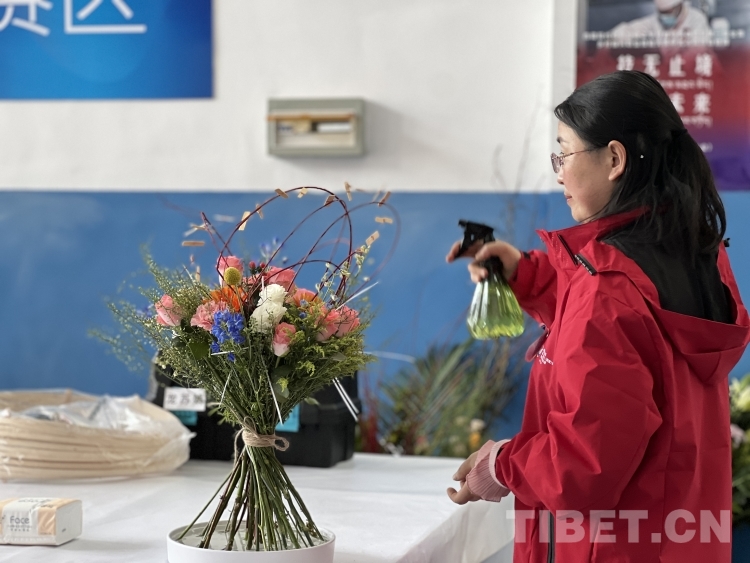 圖為林芝市職業(yè)技術學校職工組選手龍?zhí)K娟對自己的花藝作品進行噴水保鮮 攝影:德吉卓瑪