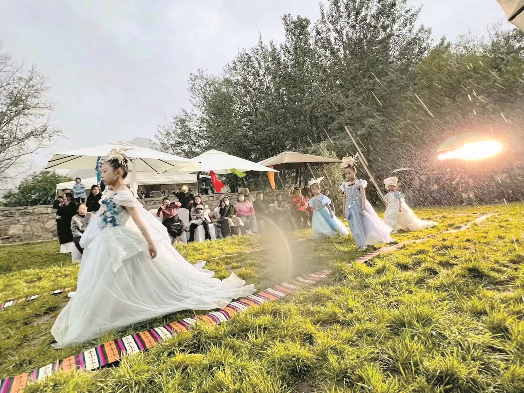 模特秀上,盡管天公不作美下起了雨,但小模特們跟隨著動感十足的韻律在雨中自信走秀,燃爆全場,極具個性色彩的藏族與苗族服裝展現(xiàn)了傳統(tǒng)文化與時尚設計的交相輝映,凸顯出“傳統(tǒng)與新潮”的極度融合,體現(xiàn)了“各美其美,美美與共”的文化關(guān)聯(lián)。