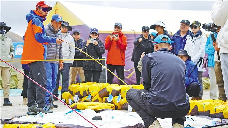 圖為西藏自治區(qū)登山隊工作人員在搭建帳篷。記者 鄭璐 袁海霞 攝
