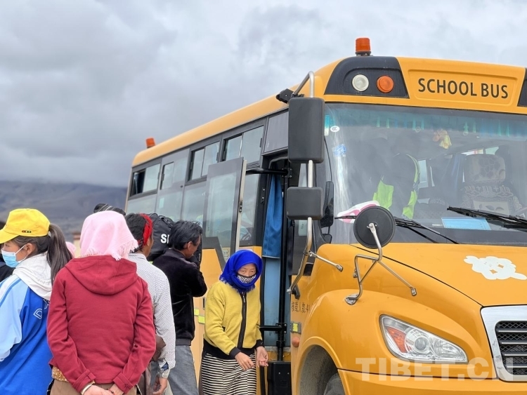 上午十一點(diǎn),穿著牧區(qū)藏袍、頭戴淺色頭巾的婦女和紅色“扎秀”(辮尾)的男士背起牛羊毛編織的背包,牽著自家小孩的手紛紛到達(dá)集合點(diǎn)。“校車來啦!”學(xué)生們在村委會院子里自覺排起了隊(duì)。