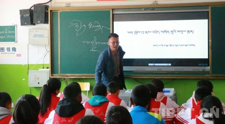 藏文老師尼瑪加措正在給初一七班的學(xué)生們講授薩迦班智達(dá)·貢嘎堅(jiān)贊的著作,里面涉及到很多為人處世、治學(xué)修身等內(nèi)容。畢業(yè)于西藏大學(xué)研究生學(xué)歷的尼瑪加措出生在西藏山南市隆子縣的一個(gè)農(nóng)民家庭,初到牧區(qū)給學(xué)生們授課時(shí)遇到方言不同交流不易和生活習(xí)慣差異等困難,但相處一段時(shí)間后看到牧區(qū)孩子們?nèi)绱藷釔鄄卣Z文課,他便毫不猶豫地選擇扎根在這里,一待便是12年。