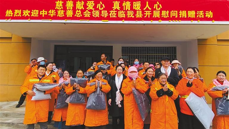近日,中華慈善總會項目部工作人員來到拉薩市當(dāng)雄縣開展慰問捐贈活動,為當(dāng)雄縣環(huán)衛(wèi)工人、納木錯水廠工人送去121件保暖衣物。
