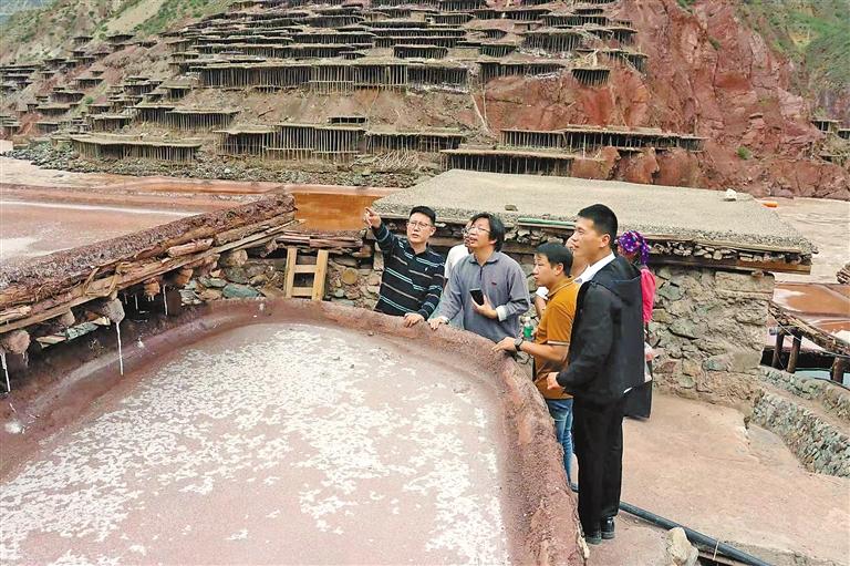 圖為芒康古鹽田考察團調(diào)研加達鹽田。通訊員 劉哲含 攝