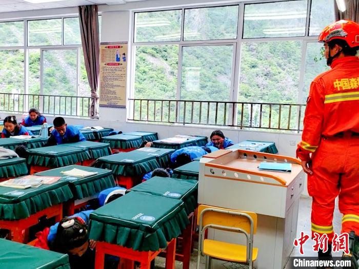 同學(xué)們在消防員的指導(dǎo)下進行地震避險演練。李國燾 攝