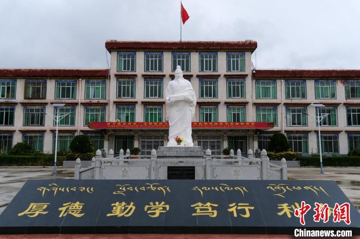 10月12日,西藏藏醫(yī)藥大學校園內矗立的藏醫(yī)藥學祖師宇妥·寧瑪云丹貢布雕像和藏漢雙語鐫刻的校訓。中新社記者 江飛波 攝