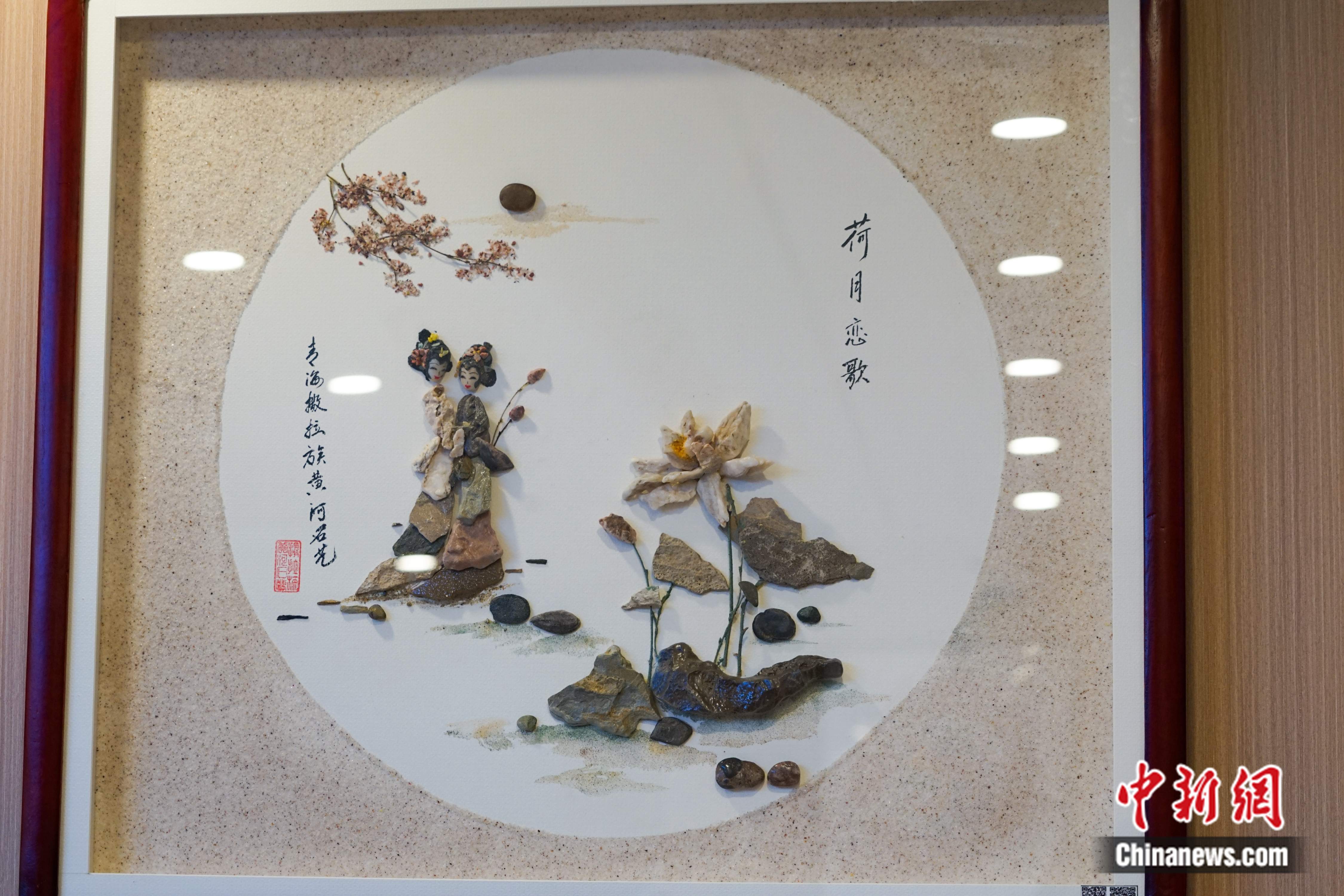 墻上懸掛的青海省民族團(tuán)結(jié)進(jìn)步形象標(biāo)識(shí),由多種少數(shù)民族刺繡共同制作而成;撒拉族婦女純手工制作的黃河石藝畫色調(diào)古雅、未經(jīng)雕琢,畫面呈現(xiàn)天然立體感,意境悠遠(yuǎn)朦朧。
