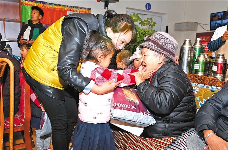 圖為拉薩市實(shí)驗(yàn)幼兒園的小朋友為老人們送上保暖衣物。記者 旦增蘭澤 攝